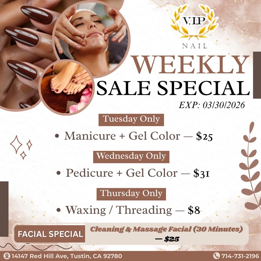 Located at a beautiful place in Tustin, CA 92780, V.I.P Nails offers you the ultimate in pampering and boosting your natural beauty with our whole-hearted, creative & professional staff.